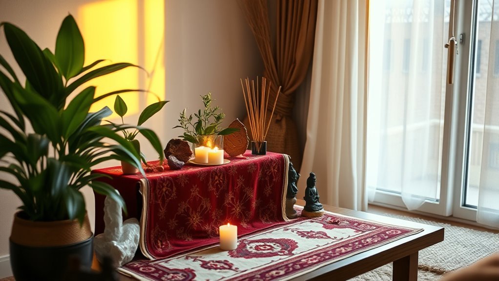 To create a sacred space at home, choose a quiet area with good natural light that minimizes distractions, and clear it of clutter. Add a small altar with meaningful objects like crystals, candles, and symbols that inspire you. Use soft lighting and comfy cushions to promote relaxation. Keep the space intentional, maintained, and evolving to suit your spiritual growth. By staying consistent, you’ll foster a tranquil environment ready to support your inner journey. Keep exploring to discover how to make it truly your own.