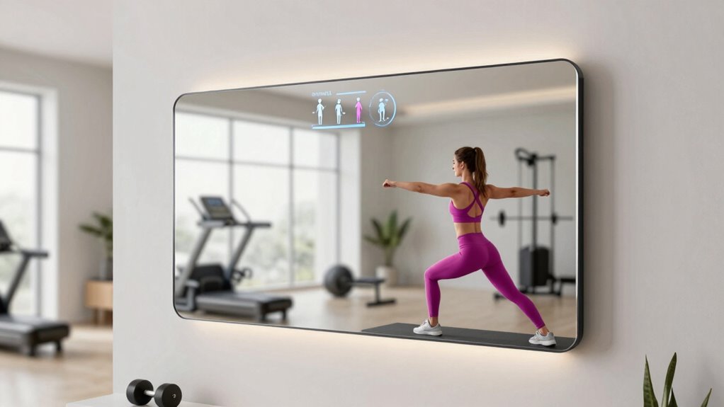 Smart mirrors revolutionize your home workouts by combining reflective displays with interactive features. They show detailed exercise instructions, timers, and progress metrics right in front of you. With sensors and cameras, they analyze your movements, give real-time feedback, and even connect you with virtual trainers through video calls. These devices track your progress over time to keep you motivated. If you’re curious about how they tailor workouts to your goals, there’s more to discover below.